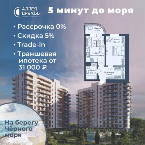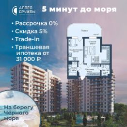 ЗВОНИТЕ ПРЯМО СЕЙЧАС, ЧТОБЫ ПОЛУЧИТЬ ВЫГОДУ ДО 650 000 руб! АКЦИИ: * Ипотека от 14,7% * ТРАНШЕВАЯ ИПОТЕКА - ПВ от 20%, платежи от 31000 в месяц * Рассрочка 0% до 2028г. ПВ от 20% * Скидка 5% * Бронь на 30 дней * 5 мин до моря пешком, планировки от 30 кв.м. * Высота потолков 3 м , предчистовая и чистовая отделка * Ипотека от СБЕРБАНКА * Доходность инвестиций от 30% годовых. * Сдача в аренду от управляющей компании (доверительное управление) позволяет получать доход от сдачи апартаментов без вашего участия * Безопасная сделка по ФЗ-214/эскроу-счёта "Аллея Дружбы" — это комплекс апартаментов бизнес-класса в Евпатории, расположенный в 5 минутах прогулки от золотистых пляжей Чёрного моря. Два современных 12-этажных корпуса с панорамными видами на море объединены стильным стилобатом с центральным входом и бутиковыми retail-площадями, а закрытая территория и подземный паркинг обеспечивает приватность и безопасность. АРХИТЕКТУРА И КОНСТРУКТИВНЫЕ ОСОБЕННОСТИ: • 12-этажное здание в авторском архитектурном стиле • Высота потолков (от 2,9 м до 3,1 м) • Эксклюзивное решение для первых этажей (высота потолков 3,4м) • Евро планировки с террасами и гардеробными • Панорамное ламинированное остекление • Индивидуальные келлеры • Видовые лоты на море • Высокоскоростные лифты по концепции 5* отеля • Предусмотрено резервное электроснабжение • По проекту предусмотрено место для кондиционера и практическое решение для маскировки коммуникаций ЛОКАЦИЯ И ОКРУЖЕНИЕ: • До центра Евпатории - 7 минут на машине • Пляж - всего 5 минут пешком • Рядом с комплексом развитая инфраструктура (рестораны, магазины, кафе, медицинские учреждения, санатории) ГОСТЕПРИИМСТВО И БЕЗУПРЕЧНЫЕ СЕРВИСЫ: • Управляющая компания премиум-класса • Консъерж-сервис 24/7 • Доставки продуктов и готовой еды • Зона ресепшн оформлена в стилистике комплекса • Лобби с атмосферным кафе и зонами для чтения • Премиальное решение для мест общего пользования • Интерактивная детская комната для самых маленьких • Пункты выдачи товаров от маркетплейсов • Гостевые парковочные места • Организовано место для хранения колясок ваших малышей • Ремонт на выбор "Комфорт-формат" и "Гранд-формат" БЕЗОПАСНОСТЬ И ТЕХНОЛОГИИ СПОКОЙСТВИЯ: • Закрытая территория, двор без машин • Система контроля доступа (строго по электронным пропускам) • Подземный паркинг с тремя типами машиномест • Выделенные места для велосипедов • Камеры видеонаблюдения • Круглосуточный ресепшн • Телеметрия - автоматический сбор и передача данных с приборов учета апартамента минимизирует ошибки и мошенничество • Система умного апартамента с дистанционным управлением БЛАГОУСТРОЙСТВО ТЕРРИТОРИИ: • Ландшафтный дизайн по проекту (2 334 м² озеленения) • Прогулочные аллеи и зоны отдыха для расслабления и медитации • Коворкинг-зоны с высокоскоростным Wi-Fi для бизнес-переговоров • Детские и спортивные площадки • В апарт-комплексе вас ждут мини-маркет и магазин повседневных товаров • Специальное пространство для курения • Выделенная площадка для