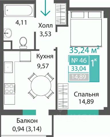 Общая площадь: 44.66 кв.м.