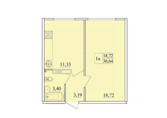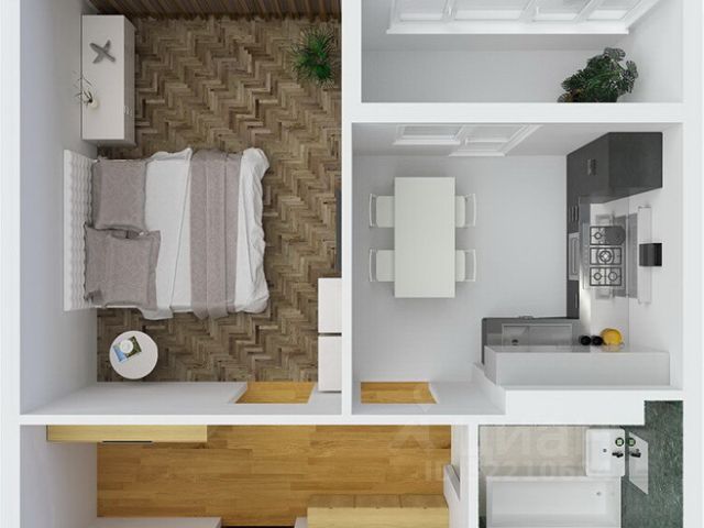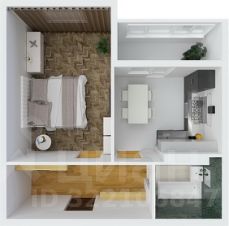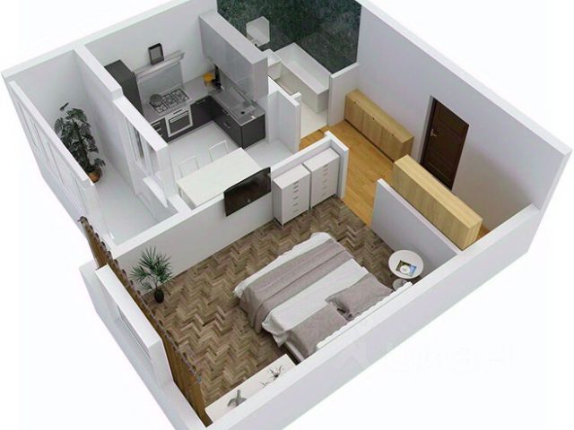 Квартира состоит из просторной комнаты 20,5 м2 и кухни-столовой 10,9 м2, соединенной с лоджией 2 м2, большой прихожей 11,9 м2 и совмещенного санузла 4 м2. Высота потолков 2,85 м.