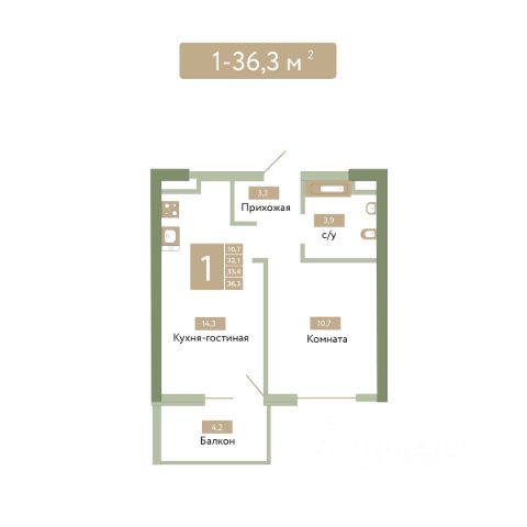 Квартира состоит из просторной комнаты 20,5 м2 и кухни-столовой 10,9 м2, соединенной с лоджией 2 м2, большой прихожей 11,9 м2 и совмещенного санузла 4 м2. Высота потолков 2,85 м.