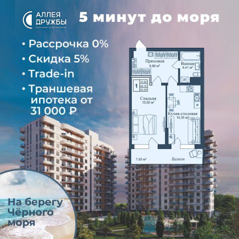 ЗВОНИТЕ ПРЯМО СЕЙЧАС, ЧТОБЫ ПОЛУЧИТЬ ВЫГОДУ ДО 650 000 руб! АКЦИИ: * Ипотека от 14,7% * ТРАНШЕВАЯ ИПОТЕКА - ПВ от 20%, платежи от 31000 в месяц * Рассрочка 0% до 2028г. ПВ от 20% * Скидка 5% * Бронь на 30 дней * 5 мин до моря пешком, планировки от 30 кв.м. * Высота потолков 3 м , предчистовая и чистовая отделка * Ипотека от СБЕРБАНКА * Доходность инвестиций от 30% годовых. * Сдача в аренду от управляющей компании (доверительное управление) позволяет получать доход от сдачи апартаментов без вашего участия * Безопасная сделка по ФЗ-214/эскроу-счёта "Аллея Дружбы" — это комплекс апартаментов бизнес-класса в Евпатории, расположенный в 5 минутах прогулки от золотистых пляжей Чёрного моря. Два современных 12-этажных корпуса с панорамными видами на море объединены стильным стилобатом с центральным входом и бутиковыми retail-площадями, а закрытая территория и подземный паркинг обеспечивает приватность и безопасность. АРХИТЕКТУРА И КОНСТРУКТИВНЫЕ ОСОБЕННОСТИ: • 12-этажное здание в авторском архитектурном стиле • Высота потолков (от 2,9 м до 3,1 м) • Эксклюзивное решение для первых этажей (высота потолков 3,4м) • Евро планировки с террасами и гардеробными • Панорамное ламинированное остекление • Индивидуальные келлеры • Видовые лоты на море • Высокоскоростные лифты по концепции 5* отеля • Предусмотрено резервное электроснабжение • По проекту предусмотрено место для кондиционера и практическое решение для маскировки коммуникаций ЛОКАЦИЯ И ОКРУЖЕНИЕ: • До центра Евпатории - 7 минут на машине • Пляж - всего 5 минут пешком • Рядом с комплексом развитая инфраструктура (рестораны, магазины, кафе, медицинские учреждения, санатории) ГОСТЕПРИИМСТВО И БЕЗУПРЕЧНЫЕ СЕРВИСЫ: • Управляющая компания премиум-класса • Консъерж-сервис 24/7 • Доставки продуктов и готовой еды • Зона ресепшн оформлена в стилистике комплекса • Лобби с атмосферным кафе и зонами для чтения • Премиальное решение для мест общего пользования • Интерактивная детская комната для самых маленьких • Пункты выдачи товаров от маркетплейсов • Гостевые парковочные места • Организовано место для хранения колясок ваших малышей • Ремонт на выбор "Комфорт-формат" и "Гранд-формат" БЕЗОПАСНОСТЬ И ТЕХНОЛОГИИ СПОКОЙСТВИЯ: • Закрытая территория, двор без машин • Система контроля доступа (строго по электронным пропускам) • Подземный паркинг с тремя типами машиномест • Выделенные места для велосипедов • Камеры видеонаблюдения • Круглосуточный ресепшн • Телеметрия - автоматический сбор и передача данных с приборов учета апартамента минимизирует ошибки и мошенничество • Система умного апартамента с дистанционным управлением БЛАГОУСТРОЙСТВО ТЕРРИТОРИИ: • Ландшафтный дизайн по проекту (2 334 м² озеленения) • Прогулочные аллеи и зоны отдыха для расслабления и медитации • Коворкинг-зоны с высокоскоростным Wi-Fi для бизнес-переговоров • Детские и спортивные площадки • В апарт-комплексе вас ждут мини-маркет и магазин повседневных товаров • Специальное пространство для курения • Выделенная площадка для