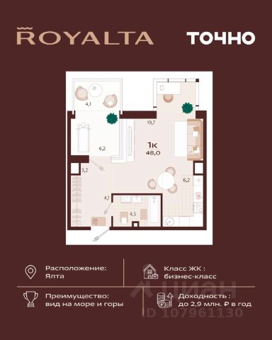 Комплекс апартаментов "Вилла Ливадия" расположен вблизи Ялты. Великолепные горно-морские пейзажи, виноградники и чистейшие, преимущественно галечные пляжи с прозрачной водой Южного Берега Крыма привлекают внимание даже самых взыскательных путешественников. Местный климат схож с Лазурным Берегом Франции, особенно с курортами Ниццей и Каннами. Это идеальное место для круглогодичного отдыха и жизни у моря. Апарт-комплекс "Вилла-Ливадия" выполнен в классическом южном стиле, светлые оттенки и фактура здания органично вписываются в природный ландшафт южного берега Крыма. Восемь этажей с потрясающими видами на хвойный лес, горы и море. Представленные планировки с одной или тремя комнатами подойдут для комфортного размещения взрослых пар, семей с детьми или больших компаний. Видовые характеристики очаруют даже опытных путешественников. С террасы верхних этажей открывается головокружительная панорама на неповторимую природу крымского побережья, Черное море и горы. Особенность комплекса - гармоничный ландшафт, озеленение внутренней среды, удачно дополняющие местные природные виды. Продуманная инфраструктура, удобные подъездные пути и собственный паркинг - приятное дополнение для жителей апарт-комплекса. В Ливадии находится одна из самых известных достопримечательностей Крыма - Летняя Резиденция Императора Николая II. Царская семья очень любила отдыхать здесь. Целебный воздух, спускаясь с гор, смешивается с морским, образуя оздоравливающий коктейль, полезный для каждого человека. В шаговой доступности от комплекса - Приморский парк с многочисленными бутиками, кафе, ресторанами и Spa-центром, а также знаменитым оборудованным пляжем "Дельфин". Апарт-комплекс "Вилла-Ливадия" - сочетание комфортного уединенного отдыха в окружении незабываемых крымских пейзажей с насыщенной и увлекательной инфраструктурой Ялты. Доступна ипотека. Продается 1-комнатная квартира на 4 этаже в республике Крым.