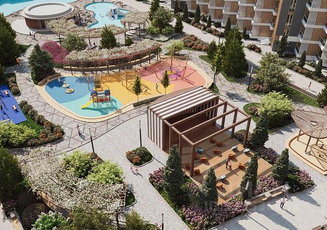 Территория площадью 4,2 Га представляет собой гармоничное пространство для людей всех возрастов, позволяет почувствовать умиротворение и доступна только для резидентов и их гостей. Во внутреннем парке, скрытом от посторонних глаз за зданиями комплекса, расположены взрослые бассейны с пул-барами и детские с горками, лаунж-зоны, воркаут и крытая детская площадка, прогулочные аллеи, беседки и гастро-бар. Площадки для шумных игр (волейбола, баскетбола и футбола, гимнастики) располагаются на пляже и с внешней стороны фасадов, чтобы не нарушать спокойную атмосферу внутри резиденции. Комплекс обладает редким сочетанием преимуществ: мягкий климат региона, удобное расположение рядом с городами Саки и Евпатория, круглогодичные бассейны и спа, целебные термальные и грязевые источники все это делает его комфортным для п