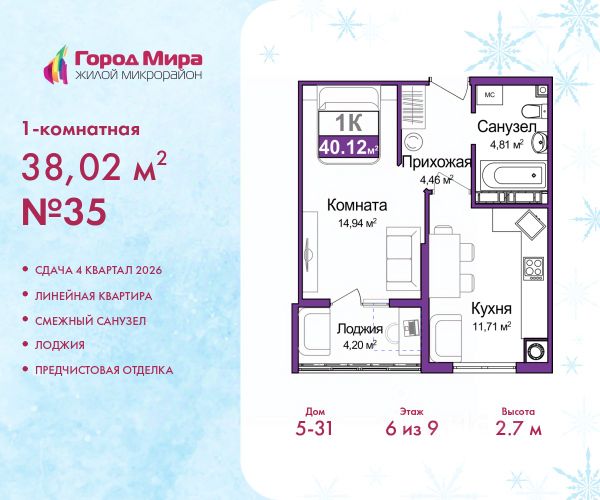 Общая площадь квартиры 31,3 кв.м, включает в себя просторную прихожую, совмещенный санузел, удобную комнату и просторную кухню с выходом на балкон.