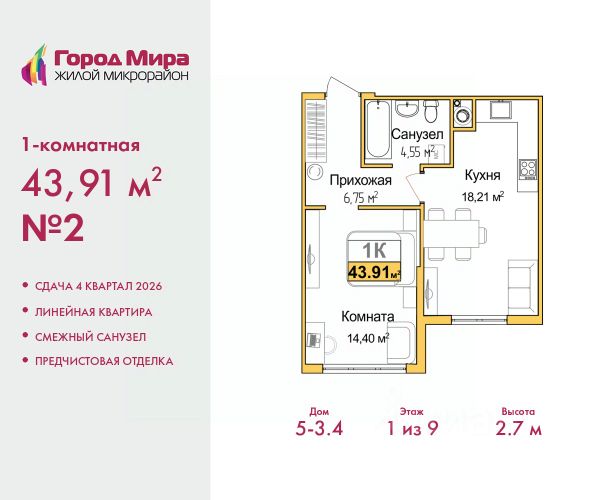 2-комн. квартира от застройщика с предчистовой отделкой в ЖМ "Город Мира" на 3 этаже. Общая площадь: 63.52 кв.м., жилая: 33.89 кв.м., площадь просторной кухни-столовой: 10.69 кв.м. Угловая квартира, очень светлая, естественная вентиляция при открытии окон. В квартире одна лоджия, один совмещенный и один раздельный санузел. Высота потолков 2.7 м.