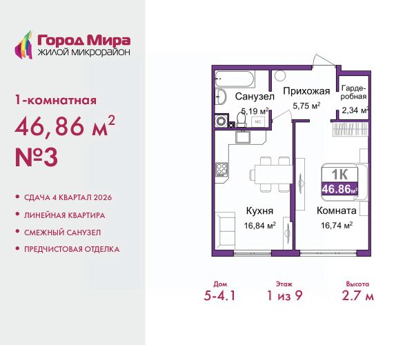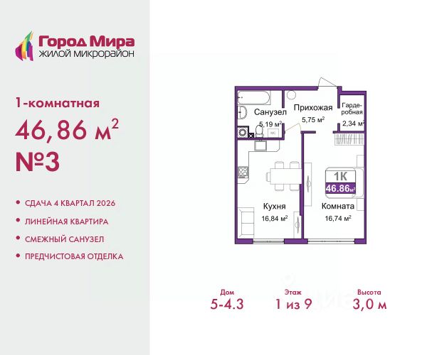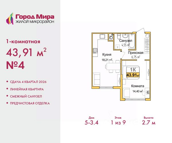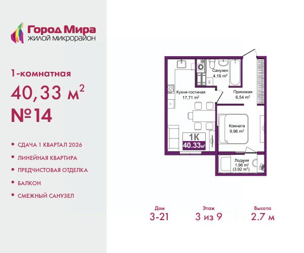 Продается 1-комн. квартира от застройщика с предчистовой отделкой в ЖМ "Город Мира" на 8 этаже. Общая площадь: 40.33 кв.м., жилая: 9.96 кв.м., площадь просторной кухни-столовой: 17.71 кв.м. Все окна выходят на одну сторону. В квартире один балкон, один совмещенный санузел. Высота потолков 2.7 м. Жилой комплекс "Город Мира" комфорт и гармония в современном формате. "Город Мира" это масштабный жилой комплекс, созданный для тех, кто ценит комфорт, безопасность и гармонию с природой. Здесь продумана каждая деталь от удобной инфраструктуры до эргономичных планировок квартир. В 2024 году микрорайон "Город Мира" победил в номинации "Лучший экологический проект года в сфере строительства" по версии премии Crimea Urban Awards. Ключевые преимущества комплекса: - удачное расположение зеленый район с благоприятным микроклиматом - продуманное зонирование жилые кварталы, зоны отдыха и коммерческие объекты - комфорт-класс высокое качество строительства и современные инженерные решения Инфраструктура "Города Мира": Образование и досуг: - 2 детских сада (по 260 мест каждый) - планируется строительство общеобразовательной школы - детские и спортивные площадки в каждом дворе - беседки для отдыха, зоны для выгула собак Ритейл и сервис: - магазины, аптеки, медицинские центры - фитнес-клубы, салоны красоты - детские развивающие центры Парковки: - гостевые парковки - наземные и подземные паркинги Квартиры с продуманным комфортом: - просторные планировки с кладовыми и колясочными - лоджии с остеклением - автономное отопление (по 23 дому: индивидуальное отопление) - выполнена стяжка пола (по 3, 4, 20, 21, 22 домам: выполненная стяжка пола и штукатурка стен) - Консьерж-сервис для дополнительного удобства Благоустройство территории: - ландшафтный дизайн с зонами отдыха - современные детские площадки - стильные холлы с дизайнерской отделкой - система видеонаблюдения для безопасности "Город Мира" это место, где созданы все условия для комфортной жизни. Выбирайте качество и продуманность в каждой детали! Квартира находится в корпусе 3_21. Дом монолитный, одноподъездный, высотой 9 этажей. В подъезде 1 грузовой лифт. Окончание строительства - 1 квартал 2026 года. Оформление сделки по договору долевого участия. #ZmSBT8