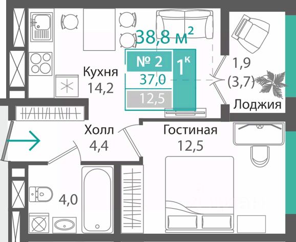 Просторная планировка: жилая зона 21,44 м², уютная кухня 7,92 м² и светлая ванная комната 5,53 м² добавят практичности. Комната 12,52 м² - станет вашим местом для отдыха. Лоджия 3,85 м² будет радовать прекрасными видами из окна. Общая площадь 51,26 м² позволяет создать интерьер вашей мечты от зоны отдыха до рабочего пространства.