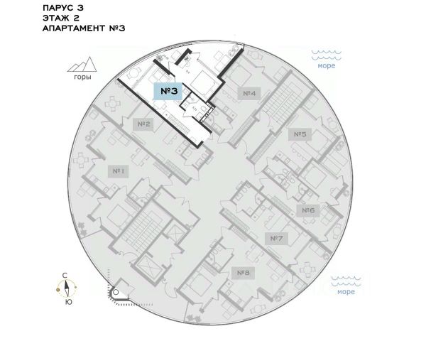 Данный апартамент имеет потрясающий вид на Крымские горы, плантации виноградников с боковым видом на море. Благодаря данному расположению в апартаменте никогда не бывает жарко, при этом вид на горы всегда в солнечном свете. А ночью шум моря не беспокоит, можно спать с открытым окном, дыша свежим морским и горным воздухом!