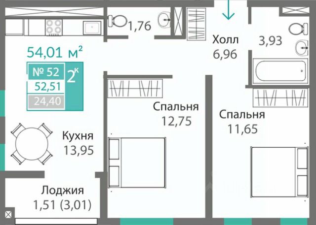 Продаётся 2-комнатная квартира в строящемся доме (Дом 3 (Секции Т3.3, К3КП2)), срок сдачи: I-кв. 2029, общей площадью 52.51 кв.м., на 6 этаже. Новый жилой комплекс "Благо" от застройщика "Монолит" расположен по адресу: Республика Крым, Симферопольский район, село Перово