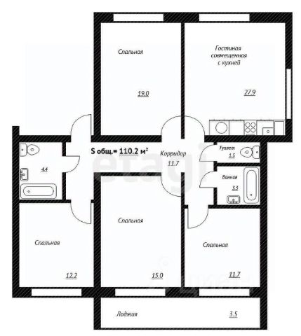 Расположена на 4 этаже пятиэтажного дома. Квартира состоит из жилых комнат 14,8 и 17,4 кв.м., кухни 9,5 кв.м., прихожая 7,9 кв. м. Раздельный санузел.