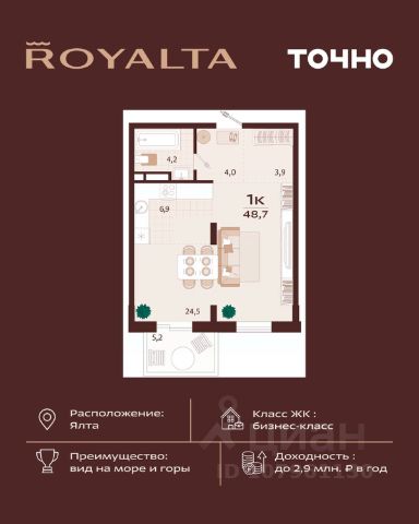 Вся инфраструктура в шаговой доступности: магазины, школа, детский сад, поликлиника, автовокзал, торговый центр, многочисленные кафе и рестораны, живописная набережная Ялты в десяти минутах езды на автомобиле.