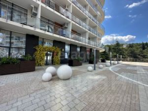 Территория закрытая, благоустроенный зеленый двор, где высажены кустовые растения, хвойные деревья, вековые кипарисы, детская площадка и наземная закрытая парковка для автомобилей.