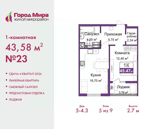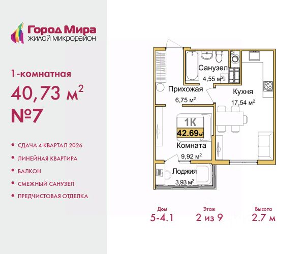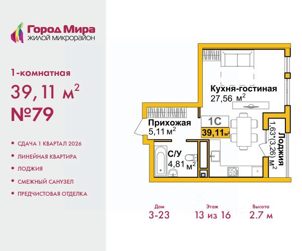 Цена посчитана с учётом скидки 3% при полной оплате или ипотеке. Информация по телефону, наши менеджеры вам все расскажут. 1-комн. квартира с предчистовой отделкой в ЖМ "Город Мира" на 11 этаже. Общая площадь: 40 кв.м., жилая: 13.6 кв.м., площадь просторной кухни-столовой: 9.2 кв.м. Все окна выходят на одну сторону. В квартире одна лоджия, один совмещенный санузел. Высота потолков 2.7 м. "Город Мира" это масштабный жилой комплекс, созданный для тех, кто ценит комфорт, безопасность и гармонию с природой. Здесь продумана каждая деталь от удобной инфраструктуры до эргономичных планировок квартир. "Город Мира" победил в номинации "Лучший экологический проект года в сфере строительства" по версии премии Сrimеа Urbаn Аwаrds. Способы приобретения недвижимости в "Городе Мира": 1. Ипотека: семейная от 5,5%, военная, IT-ипотека, базовая ипотечная программа и комбо-ипотека. Одобрение заявки проходит сразу в отделе продаж. 2. Материнский капитал на первый взнос. 3. Рассрочка от застройщика - до июня 2028 года! Первоначальный взнос от 30%. 4. Военная ипотека. Участники НИС могут приобрести квартиры по спец.цене. Ключевые преимущества комплекса: удачное расположение зеленый район с благоприятным микроклиматом продуманное зонирование жилые кварталы, зоны отдыха и коммерческие объекты комфорт-класс высокое качество строительства и современные инженерные решения Почему дом повышенной комфортности 2 в "Городе Мира" это лучшее решение? Образование и досуг: 2 детских сада (по 260 мест каждый) планируется строительство общеобразовательной школы детские и спортивные площадки в каждом дворе беседки для отдыха, зоны для выгула собак Ритейл и сервис: магазины, аптеки, медицинские центры фитнес-клубы, салоны красоты детские развивающие центры Парковки: гостевые парковки наземные и подземные паркинги Квартиры с продуманным комфортом: просторные планировки с кладовыми и колясочными лоджии с остеклением лапомойки для питомцев на первых этажах домов индивидуальное отопление выполнена стяжка пола и штукатурка стен консьерж-сервис для дополнительного удобства Благоустройство территории: ландшафтный дизайн с зонами отдыха современные детские площадки стильные холлы с дизайнерской отделкой система видеонаблюдения для безопасности "Город Мира" это место, где созданы все условия для комфортной жизни. Выбирайте качество и продуманность в каждой детали! Квартира находится во доме повышенной комфортности 2, 4-я очередь. Дом монолитно-каркасный, одноподъездный, высотой 16 этажей. В подъезде 1 пассажирский и 1 грузовой лифт. Окончание строительства - 2 квартал 2028 года. Оформление сделки по договору долевого участия. Квартира находится в корпусе 2. Дом монолитный, одноподъездный, высотой 16 этажей. На этаже 7 квартир. В подъезде 1 пассажирский и 1 грузовой лифт. Окончание строительства - 2 квартал 2028 года. Оформление сделки по договору долевого участия. #Zme29w Купить 1-комнатную квартиру в районе Центральный в городе Симферополь.