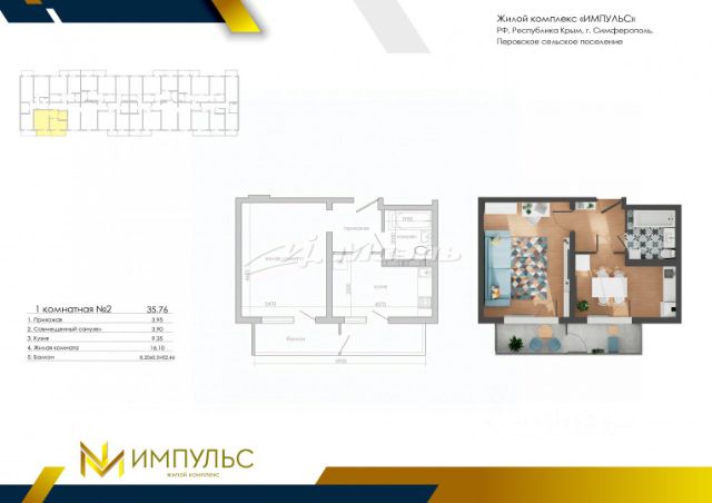 Арт. 120113837 Продаётся 1-комнатная квартира в новом ЖК "Импульс" (Симферополь, Перово) Так же представлены квартиры 1,2,3 комнаты Площадь: 35,76 м² Прихожая — 3,76 м² Санузел совмещённый — 3,9 м² Кухня — 9,35 м² Комната — 16,1 м² Преимущества: Дом комфорт-класса от надёжного застройщика СК "Консоль-Строй ЛТД" Высота потолков — 2,8 м, простор и много света Удобная планировка: кухня правильной формы, просторная комната и прихожая Современные инженерные системы, тихие лифты, благоустроенная территория Чистовая отделка под ремонт мечты Предусмотрены детские и спортивные площадки, парковочные места Расположение: Симферопольский район, село Перово, улица Южная — современный развивающийся район с удобным выездом в город. В шаговой доступности магазины, остановки, школы и детские сады. Подходит под семейную ипотеку, материнский капитал и программу "Семейная ипотека". Звоните, чтобы записаться на просмотр и узнать подробнее о квартире и жилом комплексе! Продается 1-комнатная квартира на улице Данилова в городе Симферополь.