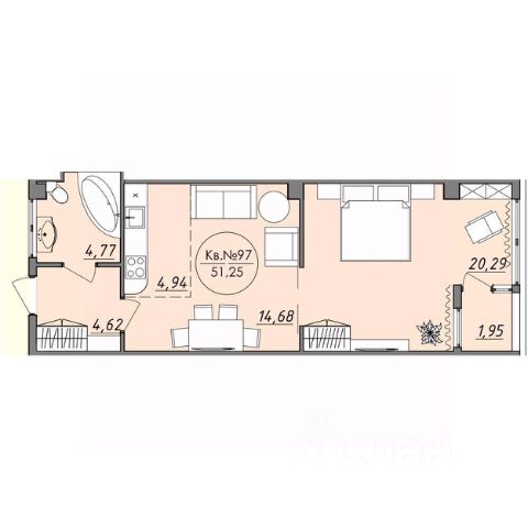 Продуманная планировка: просторная кухня для семейных завтраков, две отдельные комнаты, аккуратный санузел.
