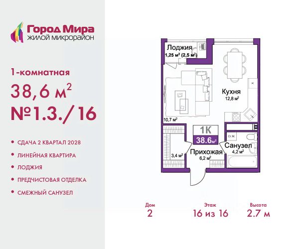 Спешите оформить бронирование, пока действует скидка, срок акции ограничен! Стоимость квартиры указана со скидкой, ваша экономия составит 222,000 руб. По всем вопросам обращайтесь в офис продаж, наши менеджеры вам все расскажут. 1-комн. квартира с предчистовой отделкой в ЖМ "Город Мира" на 16 этаже. Общая площадь: 40 кв.м., жилая: 13.6 кв.м., площадь просторной кухни-столовой: 9.2 кв.м. Все окна выходят на одну сторону. В квартире одна лоджия, один совмещенный санузел. Высота потолков 2.7 м. "Город Мира" это масштабный жилой комплекс, созданный для тех, кто ценит комфорт, безопасность и гармонию с природой. Здесь продумана каждая деталь от удобной инфраструктуры до эргономичных планировок квартир. "Город Мира" победил в номинации "Лучший экологический проект года в сфере строительства" по версии премии Сrimеа Urbаn Аwаrds. Способы приобретения недвижимости в "Городе Мира": 1. Ипотека: семейная от 5,5%, военная, IT-ипотека, базовая ипотечная программа и комбо-ипотека. Одобрение заявки проходит сразу в отделе продаж. 2. Материнский капитал на первый взнос. 3. Рассрочка от застройщика - до июня 2028 года! Первоначальный взнос от 30%. 4. Военная ипотека. Участники НИС могут приобрести квартиры по спец.цене. Ключевые преимущества комплекса: удачное расположение зеленый район с благоприятным микроклиматом продуманное зонирование жилые кварталы, зоны отдыха и коммерческие объекты комфорт-класс высокое качество строительства и современные инженерные решения Почему дом повышенной комфортности 2 в "Городе Мира" это лучшее решение? Образование и досуг: 2 детских сада (по 260 мест каждый) планируется строительство общеобразовательной школы детские и спортивные площадки в каждом дворе беседки для отдыха, зоны для выгула собак Ритейл и сервис: магазины, аптеки, медицинские центры фитнес-клубы, салоны красоты детские развивающие центры Парковки: гостевые парковки наземные и подземные паркинги Квартиры с продуманным комфортом: просторные планировки с кладовыми и колясочными лоджии с остеклением лапомойки для питомцев на первых этажах домов индивидуальное отопление выполнена стяжка пола и штукатурка стен консьерж-сервис для дополнительного удобства Благоустройство территории: ландшафтный дизайн с зонами отдыха современные детские площадки стильные холлы с дизайнерской отделкой система видеонаблюдения для безопасности "Город Мира" это место, где созданы все условия для комфортной жизни. Выбирайте качество и продуманность в каждой детали! Квартира находится во доме повышенной комфортности 2, 4-я очередь. Дом монолитно-каркасный, одноподъездный, высотой 16 этажей. В подъезде 1 пассажирский и 1 грузовой лифт. Окончание строительства - 2 квартал 2028 года. Оформление сделки по договору долевого участия. Квартира находится в корпусе 2. Дом монолитный, одноподъездный, высотой 16 этажей. На этаже 7 квартир. В подъезде 1 пассажирский и 1 грузовой лифт. Окончание строительства - 2 квартал 2028 года. Офор