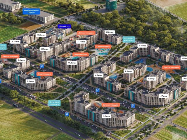 Новый жилой комплекс с собственной развитой инфраструктурой (детские сады, школы, поликлиника, спортивный клуб, развлекательная зона).