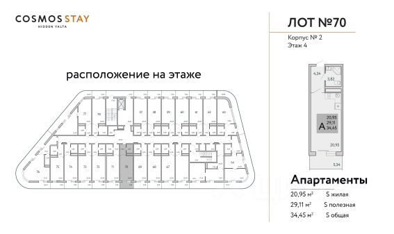 Сам апартамент включает в себя изолированную спальню с балконом, площадью 14 кв. м., наблюдать закаты и рассветы прям из своей спальни, не это ли сказка? Кухня-гостиная 18кв. м., Санузел и просторная прихожая, в которой можно выделить место под гардеробную.