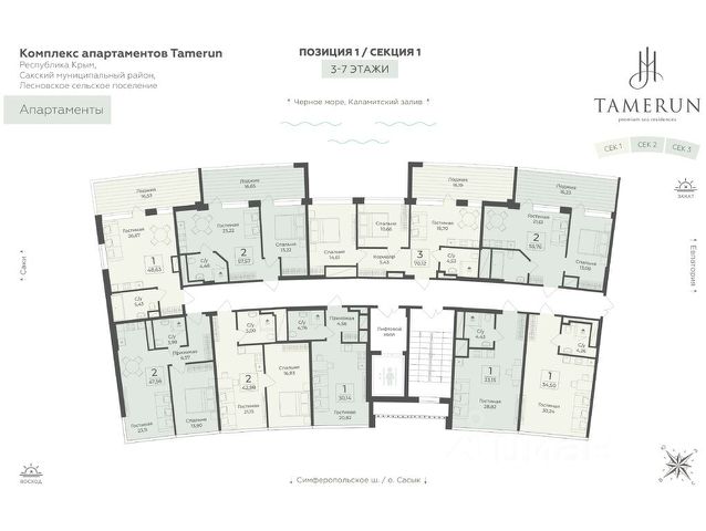 "Tamerun" - морская резиденция на Западном берегу Крыма, между городами Евпатория и Саки. Резиденция "Tamerun" представляет собой современный комплекс из четырёх корпусов высотой 9 и 12 этажей, гармонично вписанных в живописный ландшафт. Интерьеры выполнены в изысканном элегантном стиле с применением премиальных материалов — натурального мрамора, ценных пород дерева и высококачественной кожи. Просторные помещения наполнены естественным светом благодаря большим панорамным окнам, открывающим завораживающие виды на Черное море. Атмосфера резиденции пропитана уютом и гармонией, создавая идеальные условия для комфортной жизни и отдыха. Рядом с "Tamerun" находится Сасыкский заказник и самое крупное в Крыму солёное розовое озеро Сасык-Сиваш. На территории резиденции находится открытый бассейн с подогревом, окружённый шезлонгами и зоной отдыха, где можно наслаждаться теплыми лучами солнца и свежим морским бризом. Для любителей активного отдыха предусмотрен теннисный корт и фитнес-зал, оборудованный новейшими тренажёрами. В солнечной резиденции есть всё для жизни и интересного отдыха: собственный песчаный пляж и теннисный корт, бассейны с морской водой, рестораны и летнее кафе, зона СПА и фитнес-центр, общественно-деловые пространства и подземный паркинг. Профессиональная сервисная компания с международным опытом возьмёт на себя все операционные вопросы по управлению и эксплуатации, обеспечивая 5-звёздочный уровень обслуживания. Купить 1-комнатную квартиру первичка в Саки.