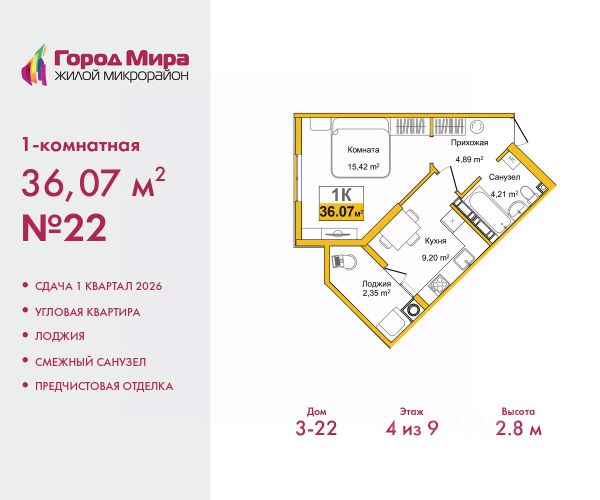 Продается 1-комн. квартира с предчистовой отделкой в ЖМ "Город Мира" на 4 этаже. Общая площадь: 36.07 кв.м., жилая: 15.42 кв.м., площадь просторной кухни-столовой: 9.2 кв.м. Угловая квартира, идеально подойдет любителям тишины и панорамных видов. В квартире одна лоджия, один совмещенный санузел. Высота потолков 2.8 м. Жилой комплекс "Город Мира" комфорт и гармония в современном формате. "Город Мира" это масштабный жилой комплекс, созданный для тех, кто ценит комфорт, безопасность и гармонию с природой. Здесь продумана каждая деталь от удобной инфраструктуры до эргономичных планировок квартир. В 2024 году микрорайон "Город Мира" победил в номинации "Лучший экологический проект года в сфере строительства" по версии премии Crimea Urban Awards. Ключевые преимущества комплекса: - удачное расположение зеленый район с благоприятным микроклиматом - продуманное зонирование жилые кварталы, зоны отдыха и коммерческие объекты - комфорт-класс высокое качество строительства и современные инженерные решения Инфраструктура "Города Мира": Образование и досуг: - 2 детских сада (по 260 мест каждый) - планируется строительство общеобразовательной школы - детские и спортивные площадки в каждом дворе - беседки для отдыха, зоны для выгула собак Ритейл и сервис: - магазины, аптеки, медицинские центры - фитнес-клубы, салоны красоты - детские развивающие центры Парковки: - гостевые парковки - наземные и подземные паркинги Квартиры с продуманным комфортом: - просторные планировки с кладовыми и колясочными - лоджии с остеклением - автономное отопление (по 23 дому: индивидуальное отопление) - выполнена стяжка пола (по 3, 4, 20, 21, 22 домам: выполненная стяжка пола и штукатурка стен) - Консьерж-сервис для дополнительного удобства Благоустройство территории: - ландшафтный дизайн с зонами отдыха - современные детские площадки - стильные холлы с дизайнерской отделкой - система видеонаблюдения для безопасности "Город Мира" это место, где созданы все условия для комфортной жизни. Выбирайте качество и продуманность в каждой детали! Квартира находится в корпусе 3_22. Дом монолитный, одноподъездный, высотой 9 этажей. В подъезде 1 грузовой лифт. Окончание строительства - 1 квартал 2026 года. Оформление сделки по договору долевого участия. #z68Dwd Купить 1-комнатную квартиру с индивидуальным отоплением в Симферополе.