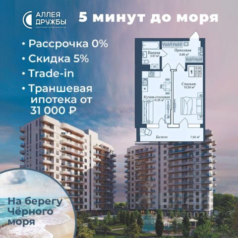 ЗВОНИТЕ ПРЯМО СЕЙЧАС, ЧТОБЫ ПОЛУЧИТЬ ВЫГОДУ ДО 650 000 руб! АКЦИИ: * Ипотека от 14,7% * ТРАНШЕВАЯ ИПОТЕКА - ПВ от 20%, платежи от 31000 в месяц * Рассрочка 0% до 2028г. ПВ от 20% * Скидка 5% * Бронь на 30 дней * 5 мин до моря пешком, планировки от 30 кв.м. * Высота потолков 3 м , предчистовая и чистовая отделка * Ипотека от СБЕРБАНКА * Доходность инвестиций от 30% годовых. * Сдача в аренду от управляющей компании (доверительное управление) позволяет получать доход от сдачи апартаментов без вашего участия * Безопасная сделка по ФЗ-214/эскроу-счёта "Аллея Дружбы" — это комплекс апартаментов бизнес-класса в Евпатории, расположенный в 5 минутах прогулки от золотистых пляжей Чёрного моря. Два современных 12-этажных корпуса с панорамными видами на море объединены стильным стилобатом с центральным входом и бутиковыми retail-площадями, а закрытая территория и подземный паркинг обеспечивает приватность и безопасность. АРХИТЕКТУРА И КОНСТРУКТИВНЫЕ ОСОБЕННОСТИ: • 12-этажное здание в авторском архитектурном стиле • Высота потолков (от 2,9 м до 3,1 м) • Эксклюзивное решение для первых этажей (высота потолков 3,4м) • Евро планировки с террасами и гардеробными • Панорамное ламинированное остекление • Индивидуальные келлеры • Видовые лоты на море • Высокоскоростные лифты по концепции 5* отеля • Предусмотрено резервное электроснабжение • По проекту предусмотрено место для кондиционера и практическое решение для маскировки коммуникаций ЛОКАЦИЯ И ОКРУЖЕНИЕ: • До центра Евпатории - 7 минут на машине • Пляж - всего 5 минут пешком • Рядом с комплексом развитая инфраструктура (рестораны, магазины, кафе, медицинские учреждения, санатории) ГОСТЕПРИИМСТВО И БЕЗУПРЕЧНЫЕ СЕРВИСЫ: • Управляющая компания премиум-класса • Консъерж-сервис 24/7 • Доставки продуктов и готовой еды • Зона ресепшн оформлена в стилистике комплекса • Лобби с атмосферным кафе и зонами для чтения • Премиальное решение для мест общего пользования • Интерактивная детская комната для самых маленьких • Пункты выдачи товаров от маркетплейсов • Гостевые парковочные места • Организовано место для хранения колясок ваших малышей • Ремонт на выбор "Комфорт-формат" и "Гранд-формат" БЕЗОПАСНОСТЬ И ТЕХНОЛОГИИ СПОКОЙСТВИЯ: • Закрытая территория, двор без машин • Система контроля доступа (строго по электронным пропускам) • Подземный паркинг с тремя типами машиномест • Выделенные места для велосипедов • Камеры видеонаблюдения • Круглосуточный ресепшн • Телеметрия - автоматический сбор и передача данных с приборов учета апартамента минимизирует ошибки и мошенничество • Система умного апартамента с дистанционным управлением БЛАГОУСТРОЙСТВО ТЕРРИТОРИИ: • Ландшафтный дизайн по проекту (2 334 м² озеленения) • Прогулочные аллеи и зоны отдыха для расслабления и медитации • Коворкинг-зоны с высокоскоростным Wi-Fi для бизнес-переговоров • Детские и спортивные площадки • В апарт-комплексе вас ждут мини-маркет и магазин повседневных товаров • Специальное пространство для курения • Выделенная площадка для