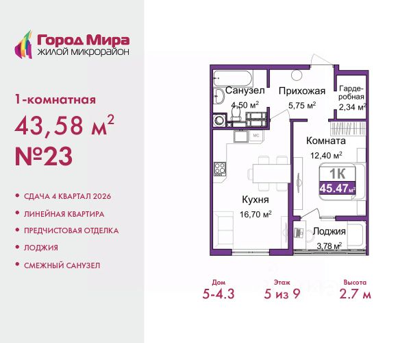 Однокомнатная квартира с предчистовой отделкой в ЖМ "Город Мира" на 5 этаже. Общая площадь: 43.58 кв.м., жилая: 12.4 кв.м., площадь просторной кухни-столовой: 16.7 кв.м. Все окна выходят на одну сторону. В квартире одна лоджия, один совмещенный санузел. Высота потолков 2.7 м. Квартиры в ЖК "Город Мира" ваш комфорт начинается здесь! "Город Мира" это масштабный жилой комплекс, созданный для тех, кто ценит комфорт, безопасность и гармонию с природой. Здесь продумана каждая деталь: от удобной инфраструктуры до эргономичных планировок квартир. В 2024 году микрорайон "Город Мира" победил в номинации "Лучший экологический проект года в сфере строительства" по версии премии Crimea Urban Awards. Почему выбирают наш комплекс: - Зеленый оазис живите среди природы в черте города. - Всё под рукой 2 детских сада, магазины, фитнес, медицина. - Безопасность: закрытая территория с видеонаблюдением. Наши квартиры: - Просторные планировки с кладовыми. - Лоджии с остеклением. - Автономное отопление: платите только за реальное потребление. - Предчистовая отделка, включает стяжку пола, без штукатурки стен. - Консьерж-сервис и подземный паркинг. Инфраструктура комплекса: - Детские и спортивные площадки. - Зоны отдыха с беседками. - Фитнес-клубы и салоны красоты. - Будущая школа на территории, уже функционируют два детских сада. Выгодные условия покупки: - Ипотека от 5,5%, военная ипотека от 5,5%. - Рассрочка. - Материнский капитал на первоначальный взнос. Квартира находится в корпусе 5_4.3. Дом монолитный, одноподъездный, высотой 9 этажей. В подъезде 1 грузовой лифт. Окончание строительства - 4 квартал 2026 года. Оформление сделки по договору долевого участия. #26dOFm