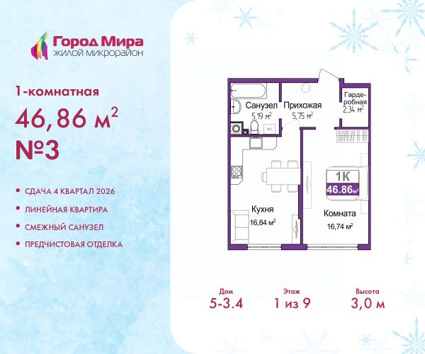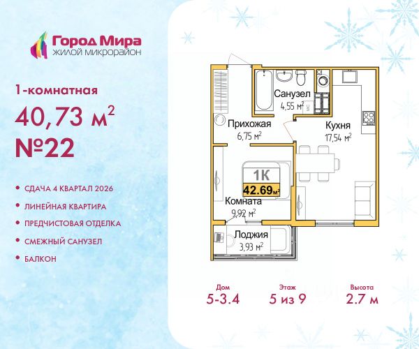 Просторная однокомнатная квартира с предчистовой отделкой в ЖМ "Город Мира" на 4 этаже. Общая площадь: 40.73 кв.м., жилая: 9.92 кв.м., площадь просторной кухни-столовой: 17.54 кв.м. Все окна выходят на одну сторону. В квартире один балкон, один совмещенный санузел. Высота потолков 2.7 м. Квартиры в ЖК "Город Мира" ваш комфорт начинается здесь! "Город Мира" это масштабный жилой комплекс, созданный для тех, кто ценит комфорт, безопасность и гармонию с природой. Здесь продумана каждая деталь: от удобной инфраструктуры до эргономичных планировок квартир. В 2024 году микрорайон "Город Мира" победил в номинации "Лучший экологический проект года в сфере строительства" по версии премии Crimea Urban Awards. Почему выбирают наш комплекс: - Зеленый оазис живите среди природы в черте города. - Всё под рукой 2 детских сада, магазины, фитнес, медицина. - Безопасность: закрытая территория с видеонаблюдением. Наши квартиры: - Просторные планировки с кладовыми. - Автономное отопление: платите только за реальное потребление. - Предчистовая отделка, включает стяжку пола, без штукатурки стен. - Консьерж-сервис и подземный паркинг. Инфраструктура комплекса: - Детские и спортивные площадки. - Зоны отдыха с беседками. - Фитнес-клубы и салоны красоты. - Будущая школа на территории, уже функционируют два детских сада. Выгодные условия покупки: - Ипотека от 5,5%, военная ипотека от 5,5%. - Рассрочка. - Материнский капитал на первоначальный взнос. Квартира находится в корпусе 5_4.1. Дом монолитный, одноподъездный, высотой 9 этажей. В подъезде 1 грузовой лифт. Окончание строительства - 4 квартал 2026 года. Оформление сделки по договору долевого участия. #zMa10D Купить 1-комнатную квартиру в ЖК Город Мира в республике Крым.