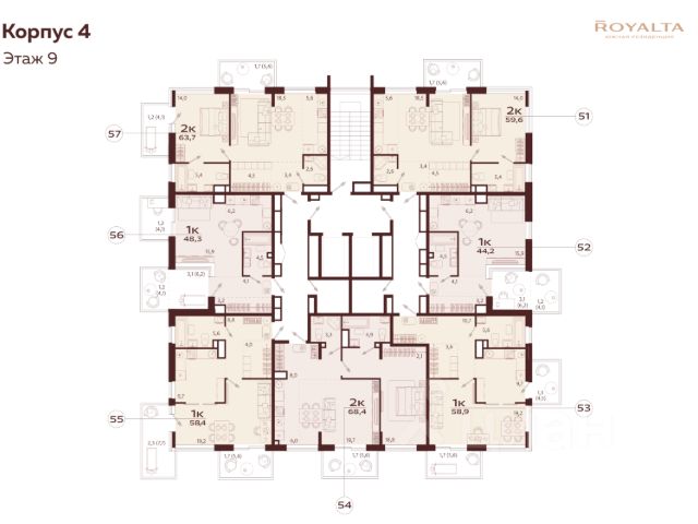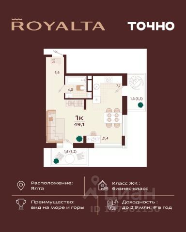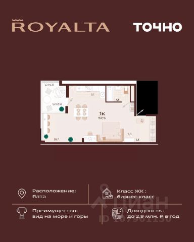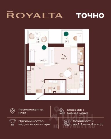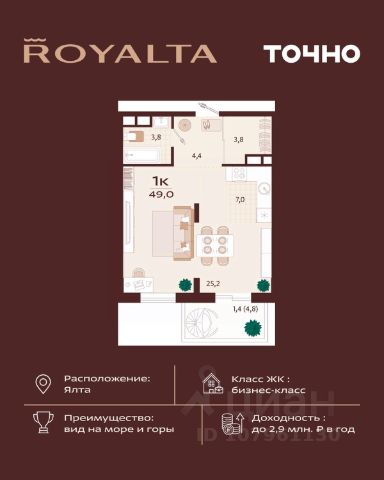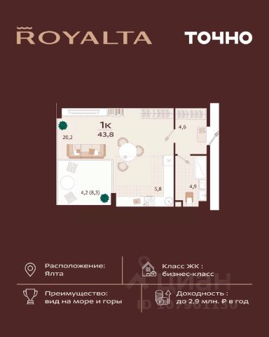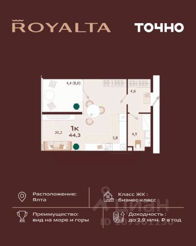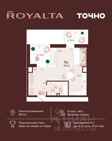 Квартира в жилом комплексе бизнес-класса Роялта. Общая площадь — 44,2 кв.м. Балкон — 4,1 кв.м. Расположена на 2-м этаже. Роялта — жилой комплекс бизнес-класса в Ялте, жемчужине черноморского побережья. Уникальность квартала во внутреннем наполнении и акценте на комфорт резидентов. Расширенные террасы, собственный СПА и фитнес-центры, ресторан, торговая галерея и аллея с краснокнижными растениями: всем этим каждый день смогут наслаждаться жители Роялты. Самая высокая точка резиденции — 70 м над уровнем моря. Воздух здесь особенно свеж, а на набережную, старый город и склоны открываются захватывающие виды. Это тихий зеленый район, но всего 15 минут пешей прогулки и вот вы на центральной набережной Ялты: рестораны, магазины и развлечения — к вашим услугам.