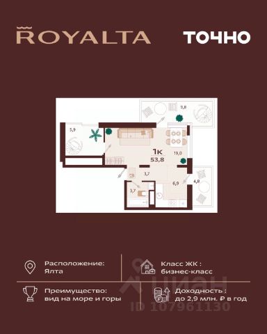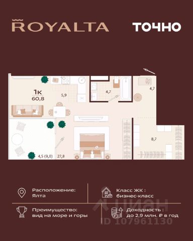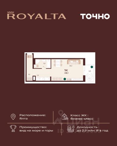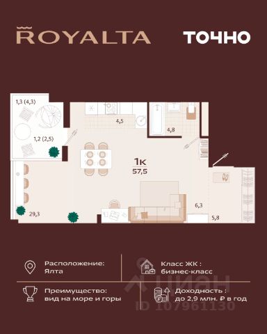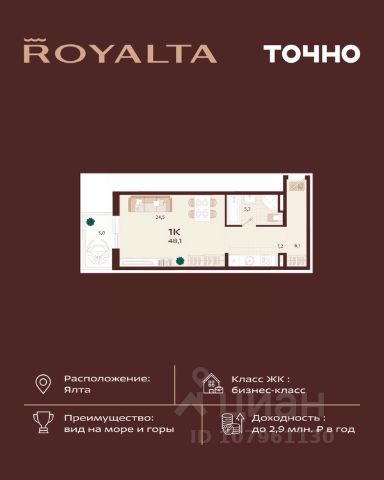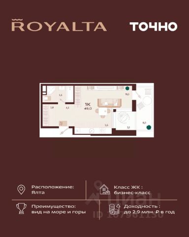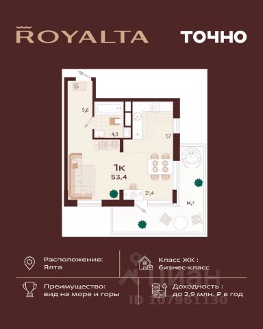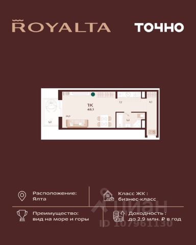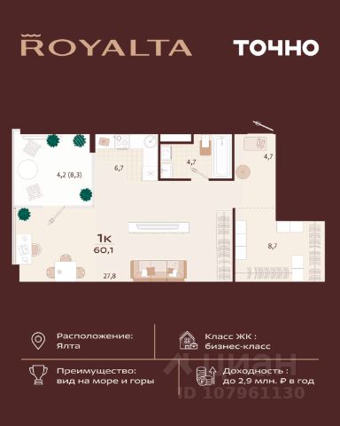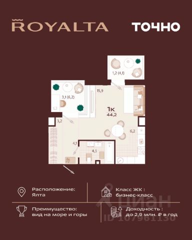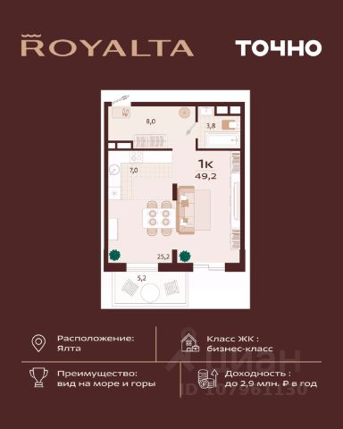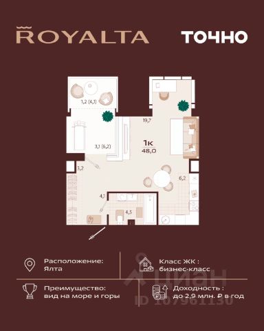 Инвестиция, которая работает на вас — в сердце Ялты, в премиум-классе с гибкой оплатой. 1-комнатная квартира 49 м² в ЖК Роялта — одном из лучших проектов Южного берега Крыма. Гибкая оплата! Рассрочка до июня 2027 г. Платежи от 100 000 ₽/мес, остаток можно в ипотеку. Почему стоит рассмотреть Роялта: • Премиум-класс: закрытая территория, подземный паркинг, бассейн Infinity. • Вид на море и горы, террасированный ландшафт, двор без машин. • Высокий инвестиционный потенциал — рост цены уже на этапе стройки. Звоните — расскажу, как зафиксировать цену и условия рассрочки.