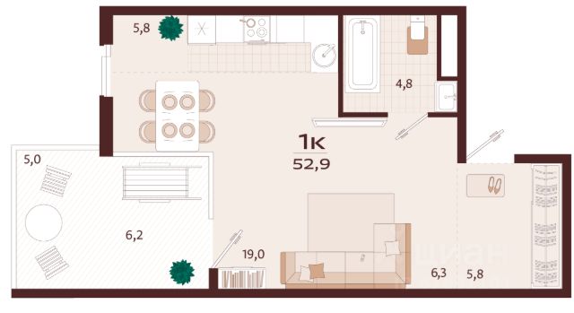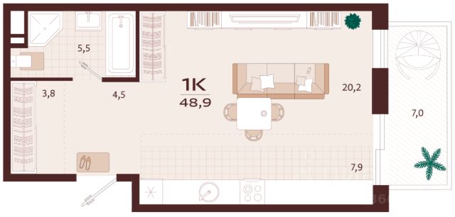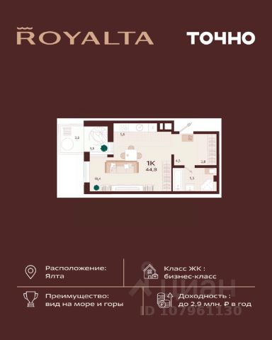 Квартира в жилом комплексе бизнес-класса Роялта. Общая площадь — 44,2 кв.м. Балкон — 4,1 кв.м. Расположена на 2-м этаже. Роялта — жилой комплекс бизнес-класса в Ялте, жемчужине черноморского побережья. Уникальность квартала во внутреннем наполнении и акценте на комфорт резидентов. Расширенные террасы, собственный СПА и фитнес-центры, ресторан, торговая галерея и аллея с краснокнижными растениями: всем этим каждый день смогут наслаждаться жители Роялты. Самая высокая точка резиденции — 70 м над уровнем моря. Воздух здесь особенно свеж, а на набережную, старый город и склоны открываются захватывающие виды. Это тихий зеленый район, но всего 15 минут пешей прогулки и вот вы на центральной набережной Ялты: рестораны, магазины и развлечения — к вашим услугам.