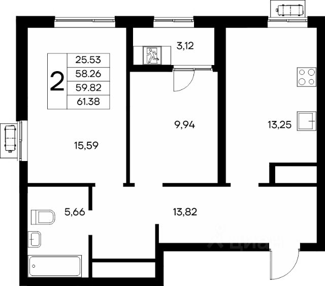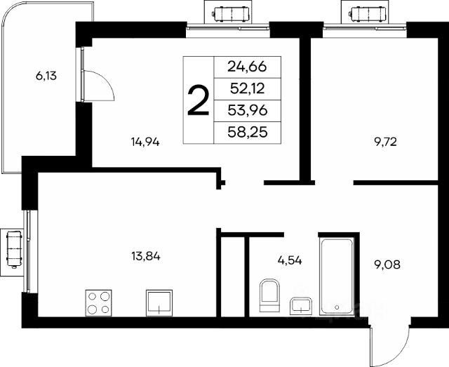 Площадь данной квартиры 62 кв.м, лоджия не входит в общую квадратуру, но она соединяет между собой две комнаты, и добавляет пространства всей квартире.