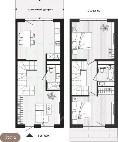 More.Yalta — это 8 корпусов высотой 8 этажей. Здесь представлены студии и 13-комнатные апартаменты площадью от 30 до 120 м². Во всех спроектированы балконы, есть варианты с гардеробными, нишами под встроенные шкафы, 2 санузлами. Апартаменты в More.Yalta сдаются с чистовой отделкой, которая включена в цену.