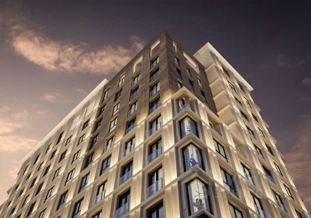 Монолитно-каркасный 16-этажный дом выполнен в современном стиле. Фасад из керамогранита светлых тонов с витражными системами остекления подчеркивает непринуждённый и гармоничный внешний вид здания.