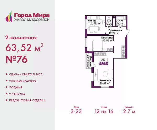 Продается двухкомнатная квартира с предчистовой отделкой в ЖМ "Город Мира" на 12 этаже. Общая площадь: 63.52 кв.м., жилая: 33.89 кв.м., площадь просторной кухни-столовой: 10.69 кв.м. Квартира угловая, очень светлая, естественная вентиляция при открытии окон. В квартире одна лоджия, один совмещенный и один раздельный санузел. Высота потолков 2.7 м. "Город Мира" это масштабный жилой комплекс, созданный для тех, кто ценит комфорт, безопасность и гармонию с природой. Здесь продумана каждая деталь от удобной инфраструктуры до эргономичных планировок квартир. Главные преимущества: Удачное расположение зеленый район с благоприятным микроклиматом Продуманное зонирование жилые кварталы, зоны отдыха и коммерческие объекты Комфорт-класс высокое качество строительства и современные инженерные решения Инфраструктура Города Мира: Образование и досуг: 2 детских сада (по 260 мест каждый) Планируется строительство общеобразовательной школы Детские и спортивные площадки в каждом дворе Беседки для отдыха, зоны для выгула собак Торговля и сервис: Магазины, аптеки, медицинские центры Фитнес-клубы, салоны красоты Детские развивающие центры Парковки: Гостевые парковки Наземные и подземные паркинги Благоустройство территории: Ландшафтный дизайн с зонами отдыха Современные детские площадки Стильные холлы с дизайнерской отделкой Система видеонаблюдения для безопасности. Почему именно 23-й дом? Комфорт и планировки: • Просторные квартиры с двумя санузлами и гардеробными • Увеличенная площадь остекления — максимум света и воздуха • Индивидуальное отопление — комфорт в любое время года Эстетика и стиль: • Дизайнерские входные группы — стиль начинается с порога • Архитектурная подсветка фасада — дом, которым хочется гордиться • Панорамные виды на город и сосновый бор рядом Инфраструктура и удобство: • Консьерж-сервис — дополнительный уровень сервиса и безопасности • Колясочные • Выполнена стяжка пола и штукатурка стен • Центральная локация внутри микрорайона — тишина и доступность Жизнь внутри дома: • Двухэтажный стилобат с коммерцией: магазины, кафе, офисы, студии и даже школа танцев • Современный двор: детский игровой комплекс, зоны отдыха для взрослых, зарядка для электромобилей, зона wi-fi на улице Возможно приобретение в ипотеку по выгодным условиям: • ставка — от 6% годовых • первоначальный взнос — от 20% • срок — до 30 лет • можно использовать материнский капитал даже на первый взнос. Также доступны военная и IT-ипотека Рассрочка от застройщика: • первый взнос от 30%, • равномерные платежи до окончания строительства. Квартира находится в корпусе 3_23. Дом монолитный, одноподъездный, высотой 16 этажей. В подъезде 1 пассажирский и 1 грузовой лифт. Окончание строительства - 4 квартал 2025 года. Оформление сделки по договору долевого участия. #z6233Z