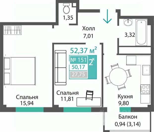 Продаётся 2-комнатная квартира в строящемся доме (ЭТАП 1, СЕКЦИИ А1, А2, А3), срок сдачи: III-кв. 2028, общей площадью 53.11 кв.м., на 2 этаже. Новый жилой комплекс "Семейный квартал ПРОПОЛИС" от застройщика "Монолит" расположен по адресу: Республика Крым, Симферопольский район, с. Мирное, ул. Учительская