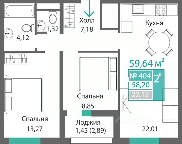 Общая площадью 68,5 кв. м, две отдельные комнаты (19.6 и 9), большая кухня-гостиная 24,5 кв. м, просторный санузел 4,6 кв. м, прихожая 4,0 кв. м, балкон 2,2 кв. м.