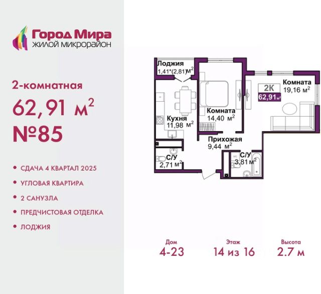 Спешите забронировать по акционной цене! Предложение ограничено! Стоимость квартиры указана со скидкой, ваша экономия составит 748,650 RUB. По всем вопросам звоните в офис продаж, мы вам все подробно расскажем! Просторная 2-комн. квартира с предчистовой отделкой в ЖМ "Город Мира" на 7 этаже. Общая площадь: 62.91 кв.м., жилая: 33.56 кв.м., площадь просторной кухни-столовой: 11.98 кв.м. Квартира угловая, окна oбecпeчивaют paвнoмepнoe ocвeщeниe в тeчeниe дня. В квартире одна лоджия, один совмещенный и один раздельный санузел. Высота потолков 2.7 м. "Город Мира" это масштабный жилой комплекс, созданный для тех, кто ценит комфорт, безопасность и гармонию с природой. Здесь продумана каждая деталь от удобной инфраструктуры до эргономичных планировок квартир. Главные преимущества: Удачное расположение зеленый район с благоприятным микроклиматом Продуманное зонирование жилые кварталы, зоны отдыха и коммерческие объекты Комфорт-класс высокое качество строительства и современные инженерные решения Инфраструктура Города Мира: Образование и досуг: 2 детских сада (по 260 мест каждый) Планируется строительство общеобразовательной школы Детские и спортивные площадки в каждом дворе Беседки для отдыха, зоны для выгула собак Торговля и сервис: Магазины, аптеки, медицинские центры Фитнес-клубы, салоны красоты Детские развивающие центры Парковки: Гостевые парковки Наземные и подземные паркинги Благоустройство территории: Ландшафтный дизайн с зонами отдыха Современные детские площадки Стильные холлы с дизайнерской отделкой Система видеонаблюдения для безопасности. Почему именно 23-й дом? Комфорт и планировки: • Просторные квартиры с двумя санузлами и гардеробными • Увеличенная площадь остекления — максимум света и воздуха • Индивидуальное отопление — комфорт в любое время года Эстетика и стиль: • Дизайнерские входные группы — стиль начинается с порога • Архитектурная подсветка фасада — дом, которым хочется гордиться • Панорамные виды на город и сосновый бор рядом Инфраструктура и удобство: • Консьерж-сервис — дополнительный уровень сервиса и безопасности • Колясочные • Выполнена стяжка пола и штукатурка стен • Центральная локация внутри микрорайона — тишина и доступность Жизнь внутри дома: • Двухэтажный стилобат с коммерцией: магазины, кафе, офисы, студии и даже школа танцев • Современный двор: детский игровой комплекс, зоны отдыха для взрослых, зарядка для электромобилей, зона wi-fi на улице Возможно приобретение в ипотеку по выгодным условиям: • ставка — от 6% годовых • первоначальный взнос — от 20% • срок — до 30 лет • можно использовать материнский капитал даже на первый взнос. Также доступны военная и IT-ипотека Рассрочка от застройщика: • первый взнос от 30%, • равномерные платежи до окончания строительства. Квартира находится в корпусе 3_23. Дом монолитный, одноподъездный, высотой 16 этажей. В подъезде 1 пассажирский и 1 грузовой лифт. Окончание строительства - 4 квартал 2025 года. Оформление сделки по догово