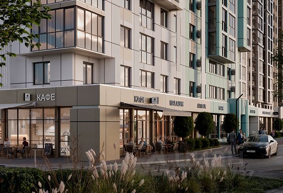 На первых этажах расположены коммерческие помещения. Витрины и вывески будут отлично просматриваться благодаря панорамному остеклению и эргономичным прямоугольным и угловым планировкам. Помещения сдаются в состоянии shell & core с проведением необходимых инженерных работ: высокие потолки 3,6-4 м, панорамное остекление, активный пешеходный и автомобильный трафик.