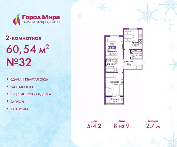 Двухкомнатная квартира с предчистовой отделкой в ЖМ "Город Мира" на 8 этаже. Общая площадь: 60.54 кв.м., жилая: 27.72 кв.м., площадь просторной кухни-столовой: 12.01 кв.м. Квартира - распашонка, без проходных комнат, окна выходят на paзные стороны дома. В квартире один балкон, один совмещенный и один раздельный санузел. Высота потолков 2.7 м. Квартиры в ЖК "Город Мира" ваш комфорт начинается здесь! "Город Мира" это масштабный жилой комплекс, созданный для тех, кто ценит комфорт, безопасность и гармонию с природой. Здесь продумана каждая деталь: от удобной инфраструктуры до эргономичных планировок квартир. В 2024 году микрорайон "Город Мира" победил в номинации "Лучший экологический проект года в сфере строительства" по версии премии Crimea Urban Awards. Почему выбирают наш комплекс: - Зеленый оазис живите среди природы в черте города. - Всё под рукой 2 детских сада, магазины, фитнес, медицина. - Безопасность: закрытая территория с видеонаблюдением. Наши квартиры: - Просторные планировки с кладовыми. - Автономное отопление: платите только за реальное потребление. - Готовая предчистовая отделка: стяжка пола, штукатурка стен (кроме 3, 4 домов, где нет штукатурки стен). - Консьерж-сервис и подземный паркинг. Инфраструктура комплекса: - Детские и спортивные площадки. - Зоны отдыха с беседками. - Фитнес-клубы и салоны красоты. - Будущая школа на территории, уже функционируют два детских сада. Выгодные условия покупки: - Ипотека от 5,5%, военная ипотека от 5,5%. - Рассрочка. - Материнский капитал на первоначальный взнос. Квартира находится в корпусе 5_4.2. Дом монолитный, одноподъездный, высотой 9 этажей. В подъезде 1 грузовой лифт. Окончание строительства - 4 квартал 2026 года. Оформление сделки по договору долевого участия. #zMgvC4