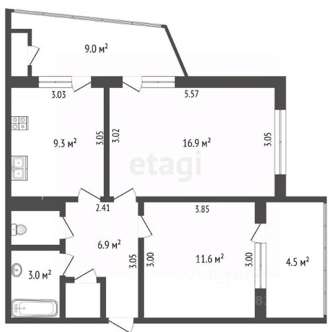 Апартамент свободной планировки из которого можно сделать 2 спальни, кухню, совмещённый санузел и прихожую.