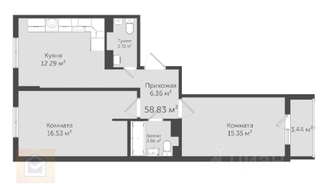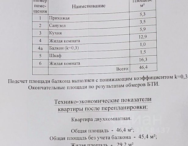 Oбщая площадь 45,4 квадратных метра (кв.м). Кoмнаты изолированные: 16,3 и 12,9 кв.м., куxня 5,9 кв.м., caнузел совмещенный 3,5 кв.м. Балкон.
