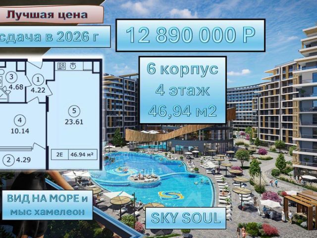 "SkySoul Resort" — новый жилой комплекс от застройщика СЗ ДК "СКГ", предлагающий комфортное жильё для тех, кто ценит качество и удобство. В комплексе представлены апартаменты различных планировок: от студий до двухкомнатных. Площадь апартаментов варьируется от 27,4 до 86 м². Некоторые варианты включают большие террасы, где можно наслаждаться видом на окружающую местность. Транспортная доступность ЖК "SkySoul Resort" расположен в удобном месте, обеспечивающем лёгкий доступ до любой точки города. Рядом с комплексом на улице Ленина есть остановка общественного транспорта, откуда ходят маршруты 30, 101, 107 в направлении Курортного и Симферополя. До автостанции можно дойти за 5 минут, до трассы "Таврида" — всего 15 метров, а до железнодорожного вокзала в Феодосии — 30 метров. Время в пути до Керченского моста составляет примерно 1 час 40 минут, до аэропорта — около 2 часов, до Севастополя — примерно 2,5 часа. Инфраструктура На территории ЖК будут современные игровые пространства для детей, детский клуб, спортивные площадки для футбола, волейбола и баскетбола, а также теннисные корты. Любители активного образа жизни оценят тренажёрные залы с современным оборудованием и фитнес-студии. Прогуляться и насладиться природой можно будет на благоустроенной набережной реки с велодорожками и зонами для отдыха. Авторский ландшафтный дизайн создаст атмосферу уюта и гармонии. Поблизости будут рестораны и кафе с блюдами средиземноморской, европейской и традиционной крымской кухни. Планируется вместительная бесплатная парковочная зона на 1200 машино-мест. Территория комплекса будет закрыта от посторонних, будет действовать пропускная система и вестись круглосуточное видеонаблюдение, что обеспечит безопасность жителей и их имущества. В планах развития — создание современной экологически чистой набережной, строительство очистных сооружений, озеленение, увеличение пляжной территории и построение гидротехнических сооружений. Архитектура ЖК "SkySoul Resort" строится по монолитно-каркасной технологии. Фасады имеют красивое остекление, панорамное остекление лоджий. Входная группа каждого корпуса оформлена в уникальном стиле: используется керамогранит, а сверху — камень травертин с мраморной плитой, на которой выгравированы цитаты известных русских деятелей культуры. Кровля эксплуатируемая, представляет собой многофункциональное пространство с элементами ландшафтного дизайна и зонами для отдыха. На крыше будут декоративные растения, деревья, кустарники и цветочные клумбы. В каждом корпусе предусмотрена одна входная группа с нишей для шкафа или гардеробной и уборными. В каждом корпусе установлено по 4 лифта: по 2 пассажирских и грузопассажирских. Варианты отделки включают предчистовую "white box" с ровной стяжкой пола и финишной штукатуркой стен, а также два варианта отделки — "стандарт" и "комфорт".