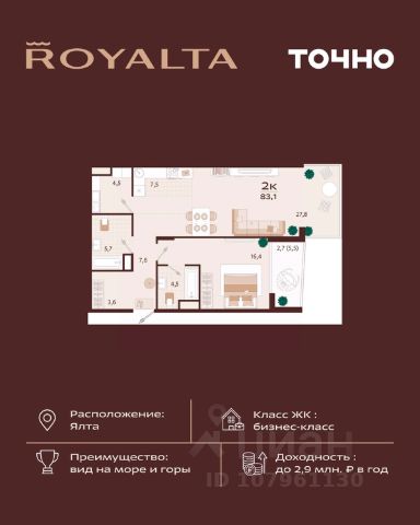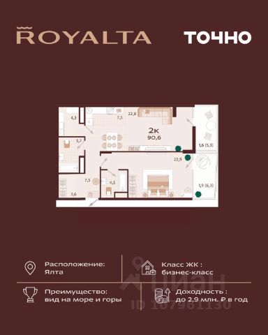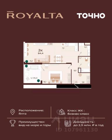 Жилой комплекс "РОЯЛТА" включает 5 монолитно-кирпичных девятиэтажных зданий. Проект предлагает квартиры различных планировок: от однокомнатных до трехкомнатных с расширенными балконами и террасами до 13,4 м2. Территория будет благоустроена детскими игровыми и спортивными площадками, гостевой автостоянкой и озеленением, включая газоны, деревья и кустарники. Также появятся современные уличные тренажёры, СПА-комплекс и панорамный инфинити-бассейн. В шаговой доступности находятся центральная набережная Ялты, детские сады, школы, супермаркеты, торговые центры, Ялтинский медицинский колледж, автовокзал и Мордвиновский парк. Продажа.