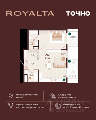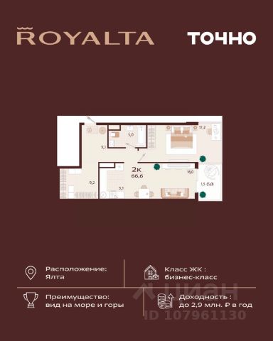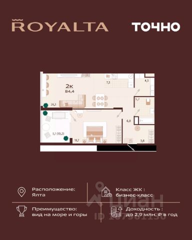 Жилой комплекс "РОЯЛТА" включает 5 монолитно-кирпичных девятиэтажных зданий. Проект предлагает квартиры различных планировок: от однокомнатных до трехкомнатных с расширенными балконами и террасами до 13,4 м2. Территория будет благоустроена детскими игровыми и спортивными площадками, гостевой автостоянкой и озеленением, включая газоны, деревья и кустарники. Также появятся современные уличные тренажёры, СПА-комплекс и панорамный инфинити-бассейн. В шаговой доступности находятся центральная набережная Ялты, детские сады, школы, супермаркеты, торговые центры, Ялтинский медицинский колледж, автовокзал и Мордвиновский парк. Продажа.