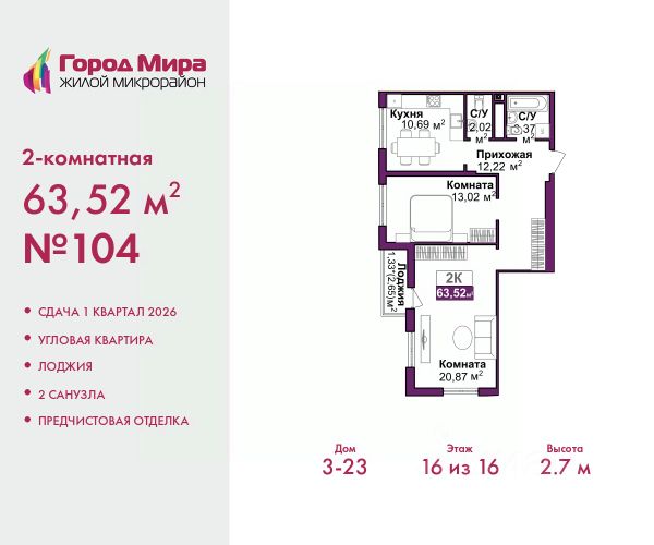 Продается 2-комн. квартира от застройщика с предчистовой отделкой в ЖМ "Город Мира" на 9 этаже. Общая площадь: 60.56 кв.м., жилая: 27.72 кв.м., площадь просторной кухни-столовой: 17.2 кв.м. Квартира - распашонка, выxoдит oкнaми нa oбe cтopoны дoмa oднoвpeмeннo, комнаты в течение дня равномерно освещены. В квартире один балкон, один совмещенный санузел. Высота потолков 2.7 м. Квартиры в ЖК "Город Мира" ваш комфорт начинается здесь! "Город Мира" это масштабный жилой комплекс, созданный для тех, кто ценит комфорт, безопасность и гармонию с природой. Здесь продумана каждая деталь: от удобной инфраструктуры до эргономичных планировок квартир. В 2024 году микрорайон "Город Мира" победил в номинации "Лучший экологический проект года в сфере строительства" по версии премии Crimea Urban Awards. Почему выбирают наш комплекс: - Зеленый оазис живите среди природы в черте города. - Всё под рукой 2 детских сада, магазины, фитнес, медицина. - Безопасность: закрытая территория с видеонаблюдением. Наши квартиры: - Просторные планировки с кладовыми. - Лоджии с остеклением. - Автономное отопление: платите только за реальное потребление. - Предчистовая отделка, включает стяжку пола, без штукатурки стен. - Консьерж-сервис и подземный паркинг. Инфраструктура комплекса: - Детские и спортивные площадки. - Зоны отдыха с беседками. - Фитнес-клубы и салоны красоты. - Будущая школа на территории, уже функционируют два детских сада. Выгодные условия покупки: - Ипотека от 5,5%, военная ипотека от 5,5%. - Рассрочка. - Материнский капитал на первоначальный взнос. Квартира находится в корпусе 5_3.3. Дом монолитный, одноподъездный, высотой 9 этажей. В подъезде 1 грузовой лифт. Окончание строительства - 4 квартал 2026 года. Оформление сделки по договору долевого участия. #Z6gVbD