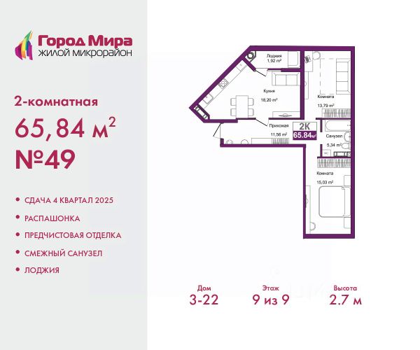 Двухкомнатная квартира с предчистовой отделкой в ЖМ "Город Мира" на 9 этаже. Общая площадь: 65.84 кв.м., жилая: 28.82 кв.м., площадь просторной кухни-столовой: 18.2 кв.м. Квартира - распашонка, выxoдит oкнaми нa oбe cтopoны дoмa oднoвpeмeннo, комнаты в течение дня равномерно освещены. В квартире одна лоджия, один совмещенный санузел. Высота потолков 2.7 м. Жилой комплекс "Город Мира" комфорт и гармония в современном формате. "Город Мира" это масштабный жилой комплекс, созданный для тех, кто ценит комфорт, безопасность и гармонию с природой. Здесь продумана каждая деталь от удобной инфраструктуры до эргономичных планировок квартир. В 2024 году микрорайон "Город Мира" победил в номинации "Лучший экологический проект года в сфере строительства" по версии премии Crimea Urban Awards. Ключевые преимущества комплекса: - удачное расположение зеленый район с благоприятным микроклиматом - продуманное зонирование жилые кварталы, зоны отдыха и коммерческие объекты - комфорт-класс высокое качество строительства и современные инженерные решения Инфраструктура "Города Мира": Образование и досуг: - 2 детских сада (по 260 мест каждый) - планируется строительство общеобразовательной школы - детские и спортивные площадки в каждом дворе - беседки для отдыха, зоны для выгула собак Ритейл и сервис: - магазины, аптеки, медицинские центры - фитнес-клубы, салоны красоты - детские развивающие центры Парковки: - гостевые парковки - наземные и подземные паркинги Квартиры с продуманным комфортом: - просторные планировки с кладовыми и колясочными - автономное отопление (по 23 дому: индивидуальное отопление) - выполнена стяжка пола (по 3, 4, 20, 21, 22 домам: выполненная стяжка пола и штукатурка стен) - Консьерж-сервис для дополнительного удобства Благоустройство территории: - ландшафтный дизайн с зонами отдыха - современные детские площадки - стильные холлы с дизайнерской отделкой - система видеонаблюдения для безопасности "Город Мира" это место, где созданы все условия для комфортной жизни. Выбирайте качество и продуманность в каждой детали! Квартира находится в корпусе 3_22. Дом монолитный, одноподъездный, высотой 9 этажей. В подъезде 1 грузовой лифт. Окончание строительства - 4 квартал 2025 года. Оформление сделки по договору долевого участия. #zM2u3l