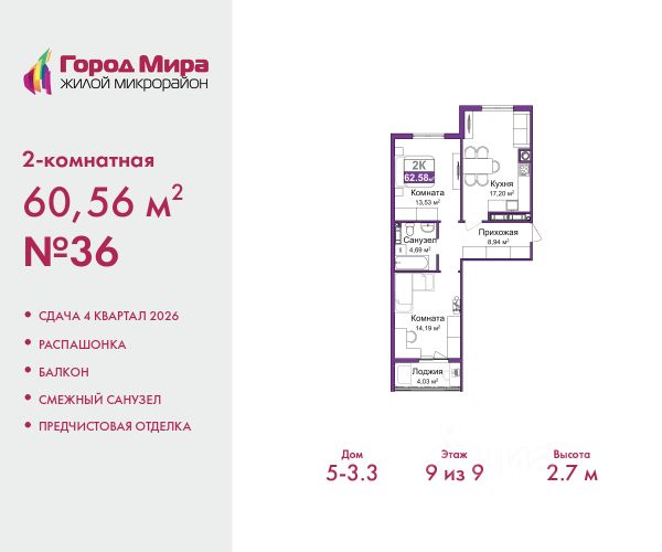 2-комн. квартира с предчистовой отделкой в ЖМ "Город Мира" на 9 этаже. Общая площадь: 60.56 кв.м., жилая: 27.72 кв.м., площадь просторной кухни-столовой: 17.2 кв.м. Квартира - распашонка, без проходных комнат, окна выходят на paзные стороны дома. В квартире один балкон, один совмещенный санузел. Высота потолков 2.7 м. Квартиры в ЖК "Город Мира" ваш комфорт начинается здесь! "Город Мира" это масштабный жилой комплекс, созданный для тех, кто ценит комфорт, безопасность и гармонию с природой. Здесь продумана каждая деталь: от удобной инфраструктуры до эргономичных планировок квартир. В 2024 году микрорайон "Город Мира" победил в номинации "Лучший экологический проект года в сфере строительства" по версии премии Crimea Urban Awards. Почему выбирают наш комплекс: - Зеленый оазис живите среди природы в черте города. - Всё под рукой 2 детских сада, магазины, фитнес, медицина. - Безопасность: закрытая территория с видеонаблюдением. Наши квартиры: - Просторные планировки с кладовыми. - Лоджии с остеклением. - Автономное отопление: платите только за реальное потребление. - Предчистовая отделка, включает стяжку пола, без штукатурки стен. - Консьерж-сервис и подземный паркинг. Инфраструктура комплекса: - Детские и спортивные площадки. - Зоны отдыха с беседками. - Фитнес-клубы и салоны красоты. - Будущая школа на территории, уже функционируют два детских сада. Выгодные условия покупки: - Ипотека от 5,5%, военная ипотека от 5,5%. - Рассрочка. - Материнский капитал на первоначальный взнос. Квартира находится в корпусе 5_3.3. Дом монолитный, одноподъездный, высотой 9 этажей. В подъезде 1 грузовой лифт. Окончание строительства - 4 квартал 2026 года. Оформление сделки по договору долевого участия. #zM9Vbd