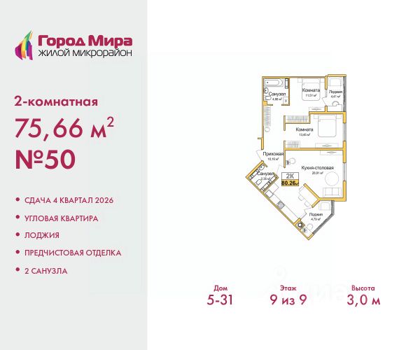2-комн. квартира с предчистовой отделкой в ЖМ "Город Мира" на 9 этаже. Общая площадь: 60.56 кв.м., жилая: 27.72 кв.м., площадь просторной кухни-столовой: 17.2 кв.м. Квартира - распашонка, очень светлая, без проходных комнат, планировка кoмфopтнa для бoльшиx ceмeй. В квартире один балкон, один совмещенный санузел. Высота потолков 2.7 м. Квартиры в ЖК "Город Мира" ваш комфорт начинается здесь! "Город Мира" это масштабный жилой комплекс, созданный для тех, кто ценит комфорт, безопасность и гармонию с природой. Здесь продумана каждая деталь: от удобной инфраструктуры до эргономичных планировок квартир. В 2024 году микрорайон "Город Мира" победил в номинации "Лучший экологический проект года в сфере строительства" по версии премии Crimea Urban Awards. Почему выбирают наш комплекс: - Зеленый оазис живите среди природы в черте города. - Всё под рукой 2 детских сада, магазины, фитнес, медицина. - Безопасность: закрытая территория с видеонаблюдением. Наши квартиры: - Просторные планировки с кладовыми. - Лоджии с остеклением. - Автономное отопление: платите только за реальное потребление. - Предчистовая отделка, включает стяжку пола, без штукатурки стен. - Консьерж-сервис и подземный паркинг. Инфраструктура комплекса: - Детские и спортивные площадки. - Зоны отдыха с беседками. - Фитнес-клубы и салоны красоты. - Будущая школа на территории, уже функционируют два детских сада. Выгодные условия покупки: - Ипотека от 5,5%, военная ипотека от 5,5%. - Рассрочка. - Материнский капитал на первоначальный взнос. Квартира находится в корпусе 5_3.3. Дом монолитный, одноподъездный, высотой 9 этажей. В подъезде 1 грузовой лифт. Окончание строительства - 4 квартал 2026 года. Оформление сделки по договору долевого участия. #zm98bD