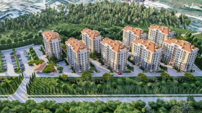 Городской пейзаж с разноцветными крышами домов и современными зданиями органично вплетается в природную картину, добавляя нотку уюта и жизни. Особенно выделяется здание с зелёной крышей — он
