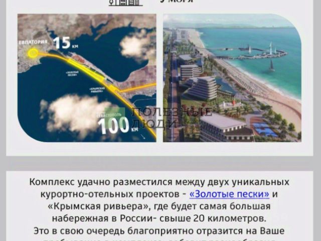 Предлагается 2 комнатная квартира возле самого синего моря с широким песчаным пляжем. Обустроенный пляж с шезлонгами, летними кафе и магазинчиками. Хорошая придомовая территория с соснами, газоном и мангальной зоной. Квартира на высоком первом этаже, имеется цокольный этаж. Подъезд оборудован пандусом. Жилая комната разделена на гостинную и выделенную спальню. Из комнаты выход на просторную лоджию, которая выходит на западную сторону и соответственно солнце только после обеда. Вся мебель и техника остается новым собственникам. Рядом строится новый современный комплекс со всей инфраструктурой для отдыха и оздоровления ( после завершения строительства будет общая территория). Соответственно цена будет совсем другая. Аквапарк " Банановая республика" в 500 метрах. До Евпатории 12 км, Симферополя 50 км. Звоните, с удовольствием отвечу на все вопросы. Возможен онлайн показ и оформление.